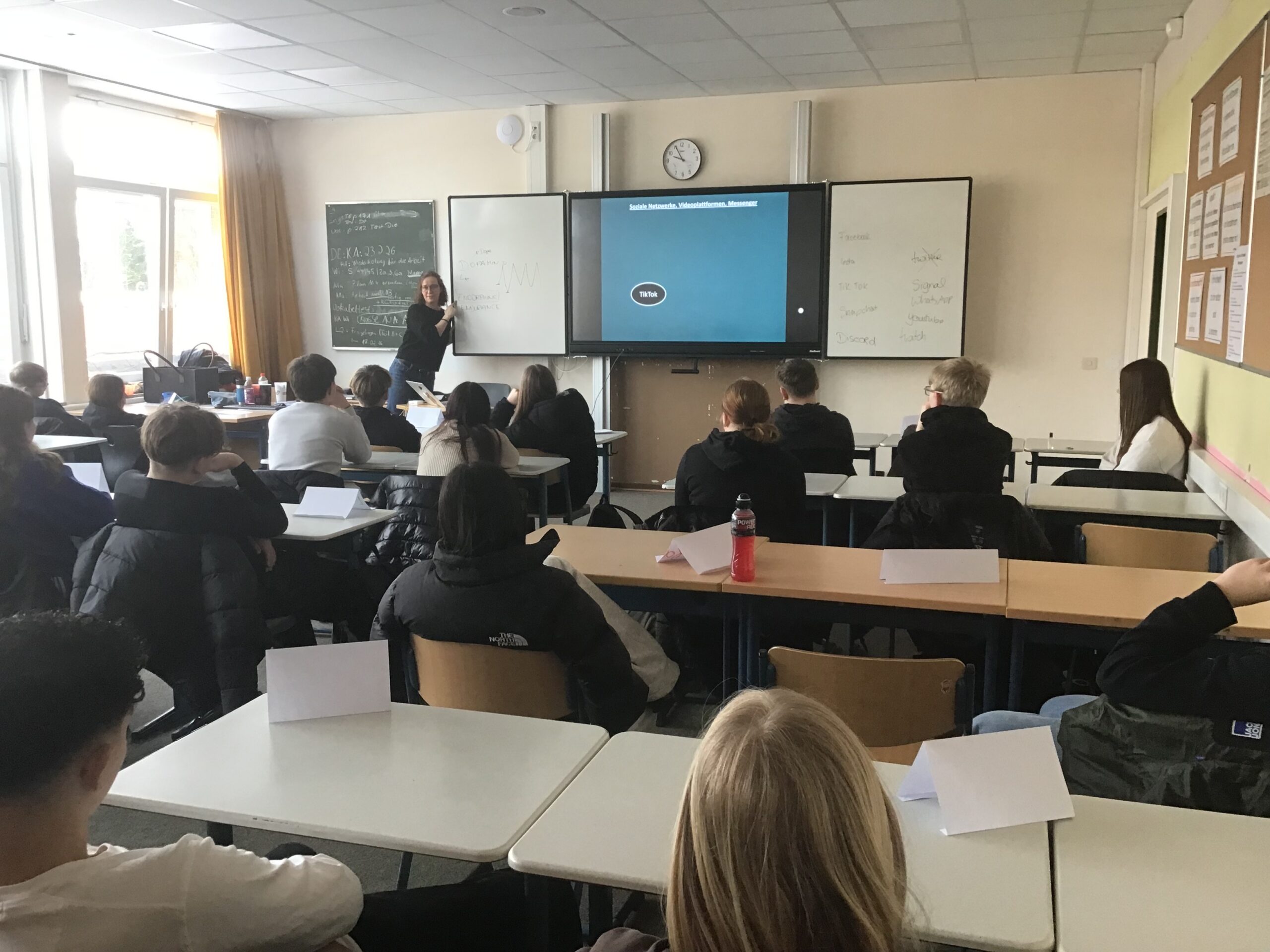 Im Rahmen der Medienkompetenz- Schulung für Jahrgang 8 war Sandra Rüger, Social Media Managerin und Medienkompetenztrainerin, zu Besuch. Ihr Anliegen ist, Schülerinnen und Schüler selbstbewusst und kompetent zu machen, damit sie sich vor Gefahren wie z.B. Cybermobbing schützen können. Die Schülerinnen und Schüler setzten sich mit ihrem eigenen Nutzerverhalten im Internet auseinander und hinterfragten es kritisch. Es war eine spannende Unterrichtsstunde und ein lohnenswerter Besuch.